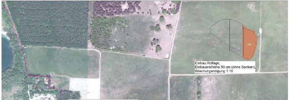 - Senken, bei denen mehrheitlich bereits Verfüllmaterial der Gruben an die Oberfläche tritt, sind bei der Verfüllung gesondert zu betrachten. Die Senken werden zunächst zur Sanierung des Standortes bis zur Geländeoberkante verfüllt. Dafür wird stärker belastetes Bodenmaterial (Oberboden, Rotlage) verwendet. Im Anschluss daran werden die verfüllten Senken mit weniger stark belastetem Bodenmaterial (teils Oberboden - Endhöhe bis zu 1,1 m, teils Rotlage - Endhöhe mindestens 0,5 m) abgedeckt.